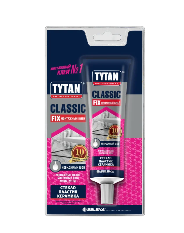 Монтажный клей Tytan Professional Classic Fix из синтетического каучука, он подходит для большинства строительных материалов. После затвердевания образует эластичный шов с повышенной адгезией к типичным строительным поверхностям, таким как бетон, дерево, кирпич и штукатурка. Используется для крепления тяжелых и легких предметов, элементов декора и изделий из пенополиуретана, дерева и его производных, металла, стекла и твердых пластиков, исключая полиэтилен, полипропилен, пенополистирол и поролон.
