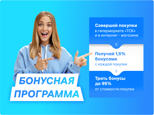 • Оплачивайте до 10% от суммы покупки бонусами при заказе на сайте или в розничном магазине, назвав свой номер телефона на кассе при покупке товара (Гипермаркеты ТСК в Новом Уренгое и Ханты-Мансийске)