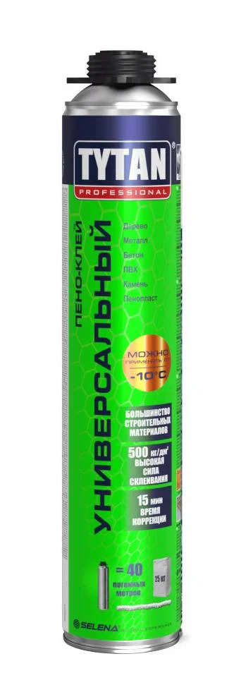 TYTAN Professional Universal является универсальным всесезонным пено клеем, производится из полиуретана, предназначен для склеивания различных материалов, включая гипсокартон, изоляционные панели, минеральную вату, пробковые плиты, полистирольные плиты и деревянные декоративные панели. Клей отличается высокими адгезионными свойствами к большинству строительных поверхностей, включая кирпич, бетон, штукатурку, древесину, металлы, пенопласт и твердый ПВХ.