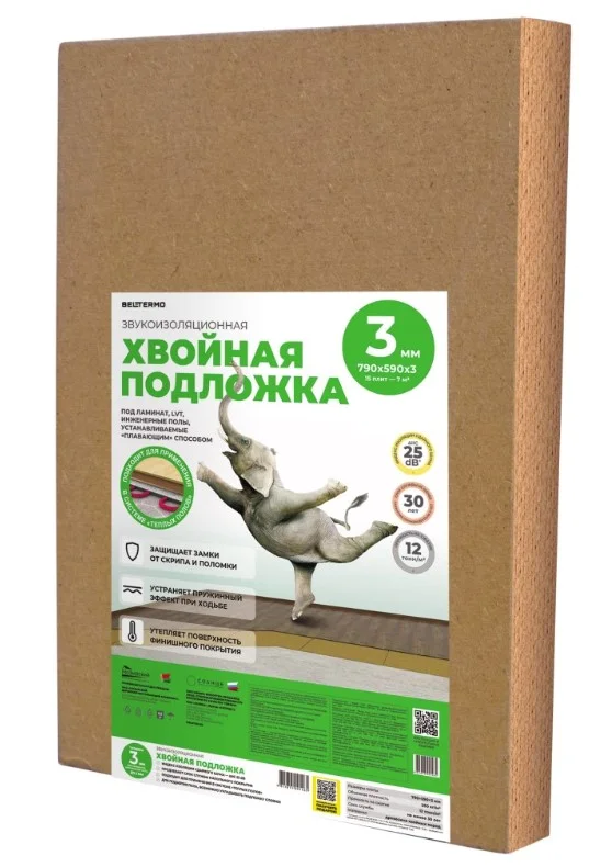 Подложка хвойная толщиной 3 мм служит тепловой и звуковой изоляцией, а также выступает в роли выравнивающего слоя под конечные напольные покрытия, такие как ламинат, паркет и кварцвинил. Она применяется на крепких и сухих базовых основаниях и может дополнительно усиливать тепло- и звукоизоляцию. Хвойная подложка для ламината создана, чтобы обеспечить комфортную акустическую среду в вашем жилище. Уложенная под ламинат или паркет, она значительно уменьшает «ударные» шумы, тем самым прерывая звуковые связи между полом и остальными поверхностями в вашем доме.