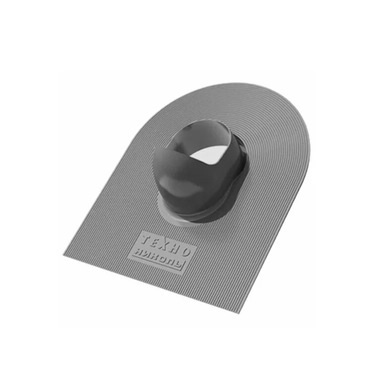 Проход через мягкую кровлю – это небольшое полипропиленовое изделие, предназначенное для установки выходов вентиляции и канализации на крыши из гибкой черепицы. Продукция выполнена в сером цвете.