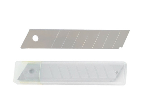 Предназначены для разрезания пленки, плотной бумаги, картона и других материалов. Являются сменным элементом основного выдвижного лезвия для резаков соответствующего размера. Насечки на лезвии позволяют оперативно заменить затупившийся сегмент. Материал: сегментированные (7 сегментов) лезвия 18 х 100 мм, толщина 0,5 мм из высокоуглеродистой стали с равномерно заточенной режущей кромкой. Набор из 10 шт. Упаковка пластиковый бокс.