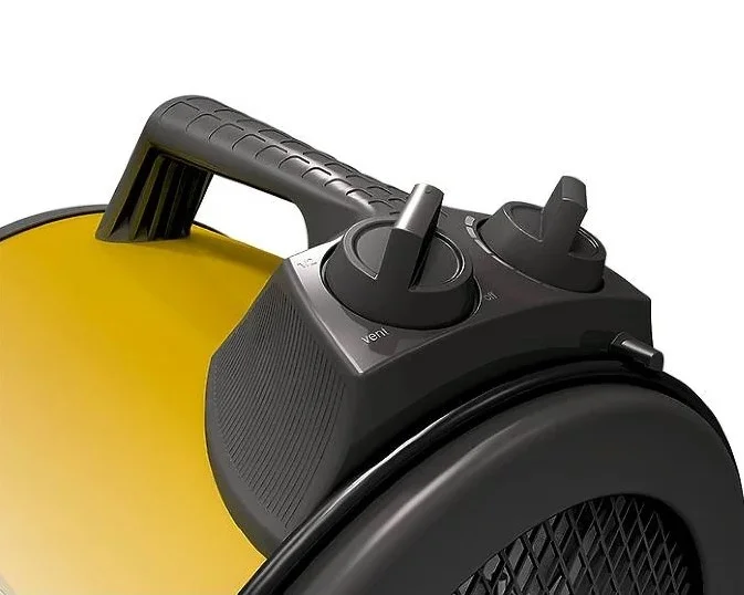 Нагревательные элементы особой формы способствуют созданию более эффективного направленного воздушного потока. В пушке предусмотрено 2 режима мощности и режим вентиляции. Прибор просто подключается к сети с помощью кабеля с вилкой.