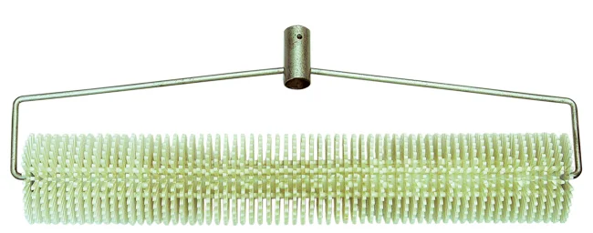 Игольчатые валики изготавливают из пластмассы, имеет универсальную ручку, в которую вставляется удлинитель. Такой валик создает максимальное удобство в работе с наливными смесями, избавляя от излишних усилий. Процесс прокатывания жидкой смеси является обязательным. так как при высыхании в смеси получаются полости, заполняемые воздухом, что негативно влияет на прочность наливного покрытия. Прокатывая смесь, тем самым удаляются пузырьки воздуха, благодаря чему смесь ляжет более равномерно.