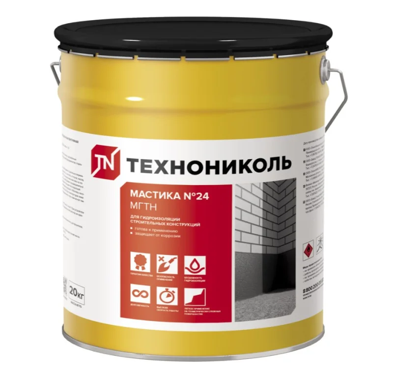 Мастика гидроизоляционная ТЕХНОНИКОЛЬ № 24 (МГТН) представляет собой полностью готовый к применению материал на основе нефтяного битума, содержащий технологические добавки, минеральные наполнители и растворитель.