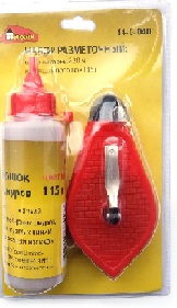 Набор разметочный состоит из шнура малярного и красящего порошка. Шнур малярный (отбивочный шнур) предназначен для разметки прямых линий, методом отбивки нити красящим порошком. Корпус изготовлен из ударопрочной ABS пластмассы. Длина шнура 20 м. Использовать малярный шнур довольно просто. Необходимо натянуть шнур между двумя предварительно поставленными метками, и оттянув шнурок от поверхности на небольшое расстояние, хлопнуть им о поверхность, на которой требуется разметка. Таким образом, красящий порошок, прилипший к шнурку, оставит чёткую, цветную прямую линию на этой поверхности. Так как в устройстве применяется специальный строительный красящий порошок, то чёткая линия получается почти на любой поверхности: на бетоне, на кирпиче, на стяжке, на пластике, на гипсокартоне, на дереве, и даже на стекле.Для того, что бы заправить малярный шнур, необходимо открутить черный колпачек на его корпусе (в нём выходное отверстие нити), затем размотав шнур с катушки, всыпать красящий порошок внутрь, после чего необходимо закрутить колпак и смотать катушку малярного шнура, периодически встряхивая корпус для равномерного распространения порошка внутри. Конец нити имеет металлическое крепление для более надежной фиксации при проведении разметки. Наматывающая ручка изготовлена из металла. Наматывающая ручка изготовлена из металла. Красящий порошок, входящий в набор, предназначен для заправки малярного шнура. Порошок упакован в пластмассовый флакон с отрезным носиком.
