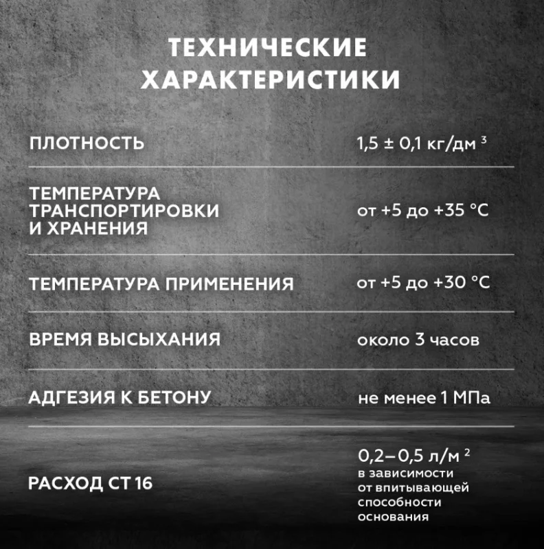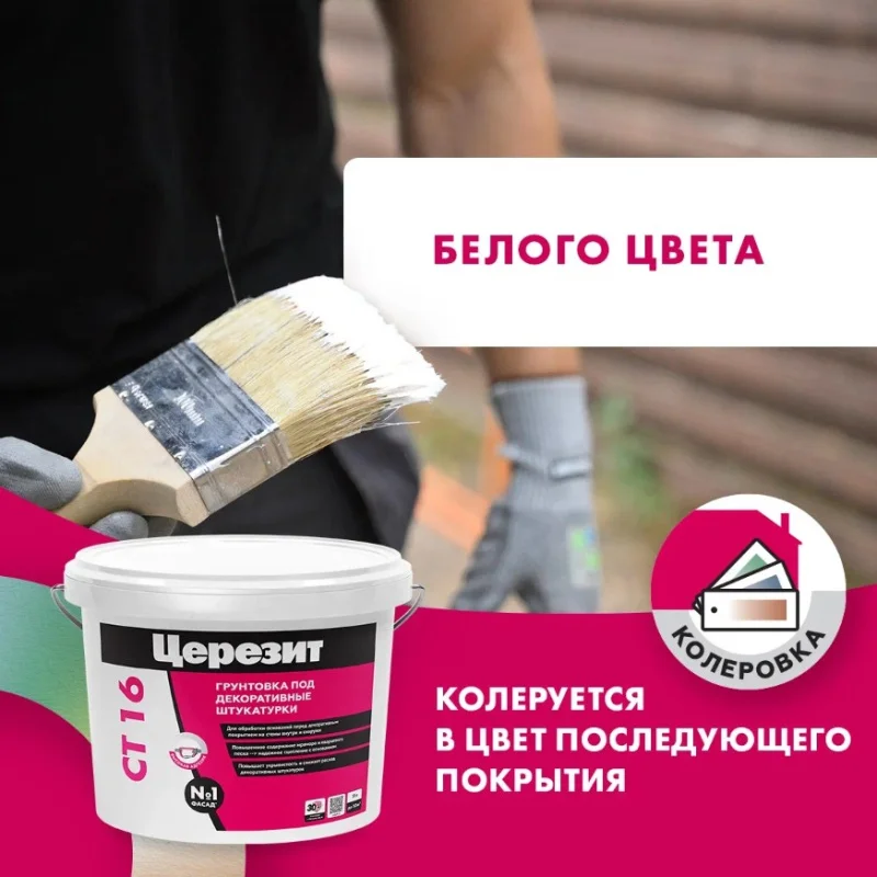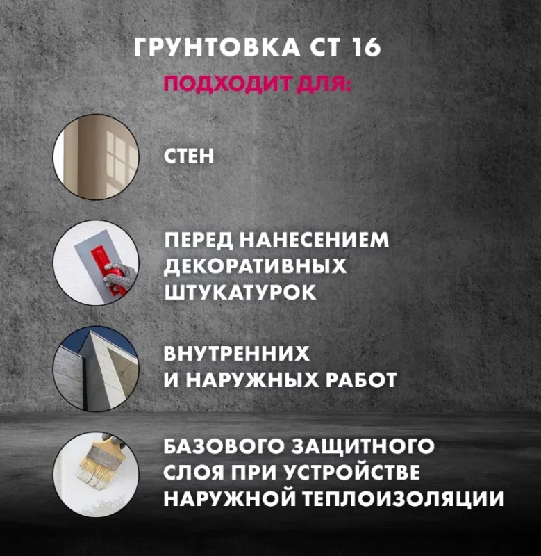 Грунтовка CT 16 предназначена для обработки оснований перед нанесением декоративных штукатурок на стены при внутренних и наружных работах.