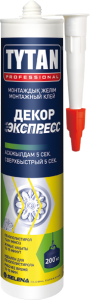 Монтажный клей Tytan Decor Express на основе акрила используется для приклеивания декоративных элементов из пенопласта и легких изделий из полиуретана к впитывающим строительным основаниям, таким как дерево, бетон, кирпич, штукатурка и гипсокартон.