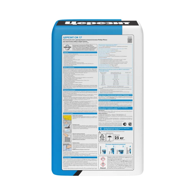 Клей СМ 17 предназначен для крепления всех видов минеральных плиток – керамических, керамогранитных, клинкерных, каменных (кроме мраморных) и т.п., на стенах и полах