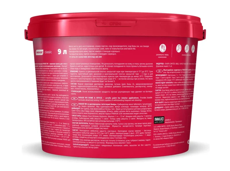 PARADE W4 дом и офис является акриловой матовой водно дисперсионой краской для стен и потолков внутри помещений. Создает прочное, матовое паропроницаемое покрытие, которое выдерживает частое мытье. Имеет отличные декоративные свойства и укрывистость. Сертифицирован для использования в детских и медицинских учреждениях, может быть заколерован с помощью компьютерной колеровки по системе Parade или с использованием водных красителей. Обеспечивает долговечность и эстетичность интерьерного покрытия