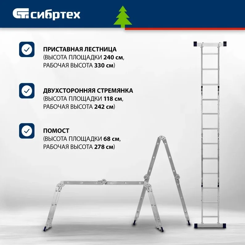 Шарнирная алюминиевая лестница СИБРТЕХ 4х3 97881 может трансформироваться в зависимости от выполняемых работ.