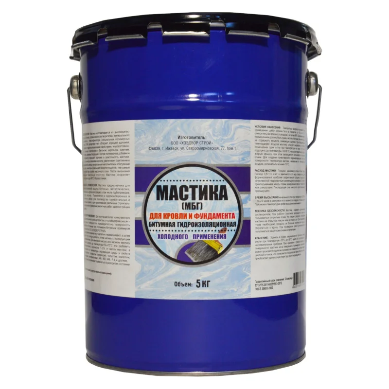Мастика изготавливается из высокакачественных битумов, органических растворителей, специальных полимерных добавок и минерального наполнителя, вследствие чего обладает высокой теплостойкостью, адгезией и хорошими клеющими и гидроизоляционными свойствами.