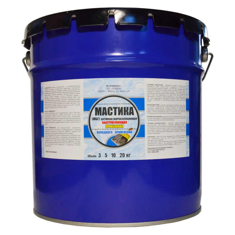 Мастика изготавливается из высокакачественных битумов, органических растворителей, специальных полимерных добавок и минерального наполнителя, вследствие чего обладает высокой теплостойкостью, адгезией и хорошими клеющими и гидроизоляционными свойствами.