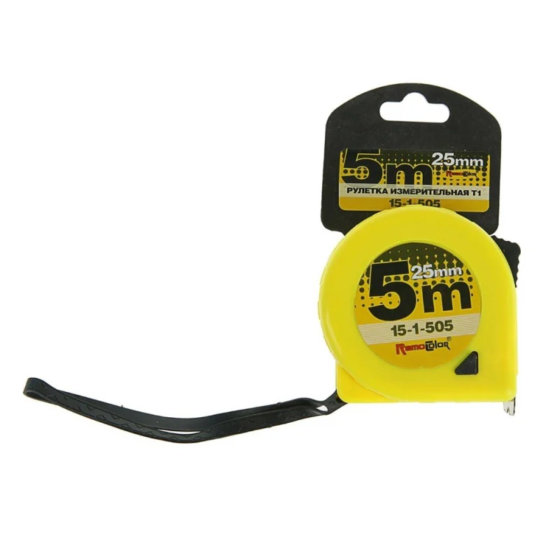 Корпус из ABS-пластика, холоднокатаная лента с трехслойным покрытием (краска, шкала, лак), возвратная пружина усиленного типа, две кнопки фиксации ленты.