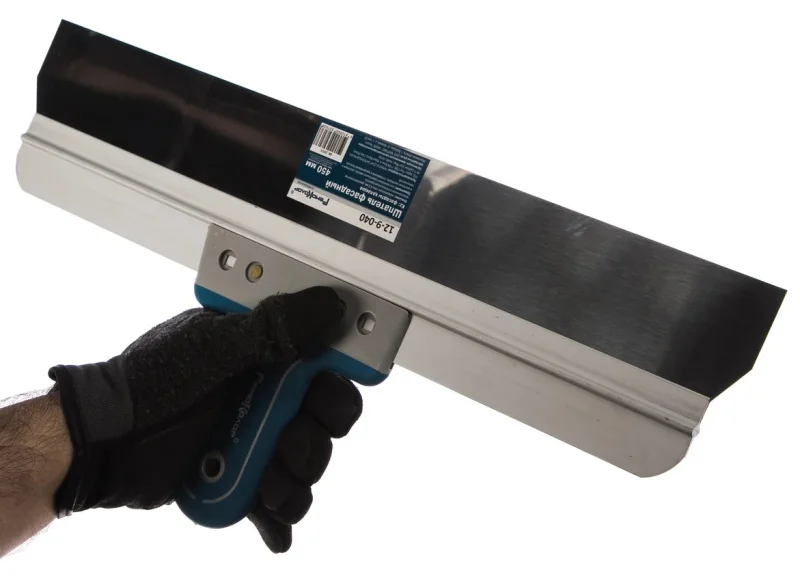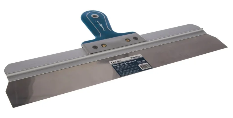 Фасадный шпатель с двухкомпонентной рукояткой, 450 мм РемоКолор 12-9-040 используется во время проведения отделочных работ.