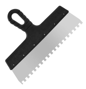 Фасадный зубчатый шпатель (нержавеющая сталь, 300мм, зуб.8x8мм) РемоКолор Мастер 12-8-300 служит для нанесения цементного состава во время укладки кафельной плитки.
