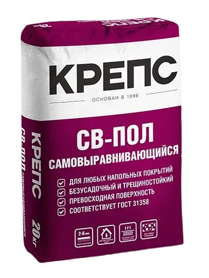 КРЕПС СВ-пол – ровнитель финишный самовыравнивающийся. Высокомодифицированная сухая выравнивающая напольная смесь наливного типа на основе комплексного вяжущего и фракционированного песка. Обладает трещиностойкостью и быстрым набором прочности.