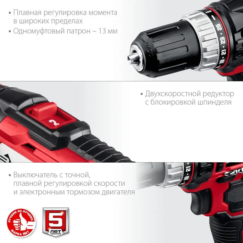 Двухскоростной планетарный редуктор позволяет заворачивать с большим крутящим моментом и сверлить на высоких оборотах.