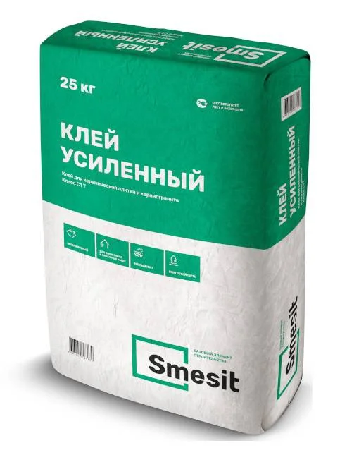 Клей Усиленный Smesit предназначен для внутренних и наружных работ при облицовке стен и пола керамической плиткой и пола керамогранитной плиткой.